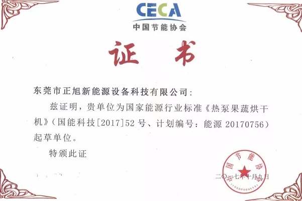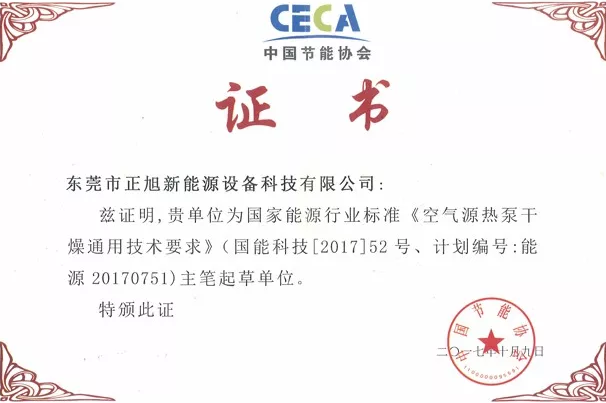 其中,正旭新能源为《空气源热泵粮食干燥机》、《空气源热泵烟叶干燥机》、《空气源热泵烤烟烤房技术规程》三项标准起草单位。此外,正旭是国家能源行业标准《空气源热泵干燥通用技术要求》主笔起草单位,《热泵果蔬烘干机》、《户用及类似用途空气源热泵采暖机组》等标准起草单位。