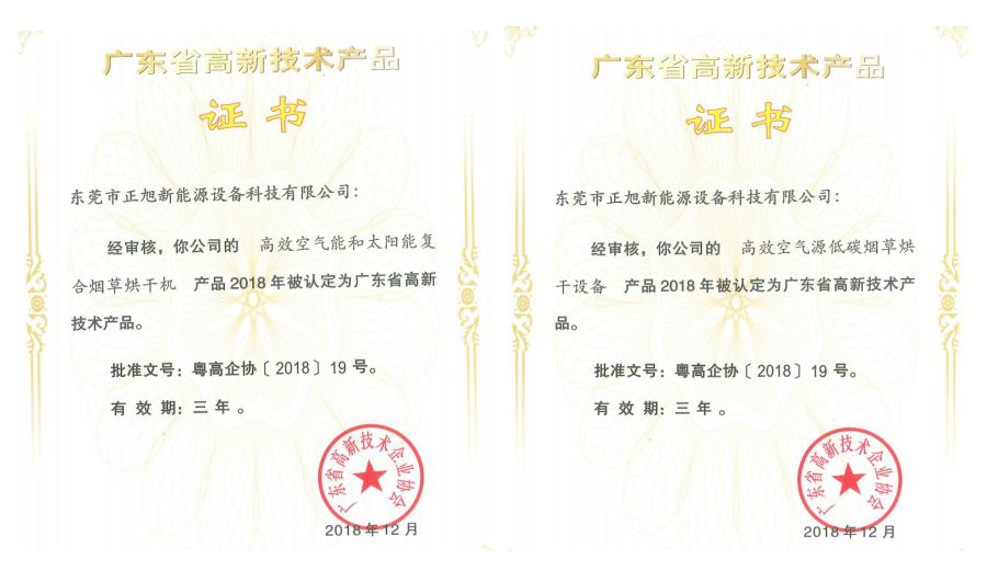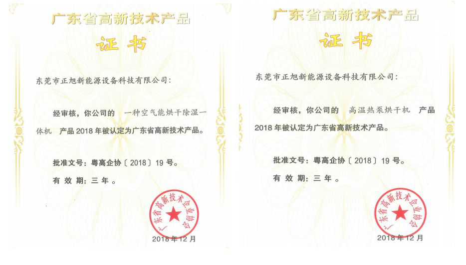 在过去的2018年,正旭热泵烘干荣获广东省高新技术企业协会颁发的13项高新技术产品证书。正旭在热泵烘干领域中的努力,得到了高新技术协会的充分肯定。13项高新技术产品证书包括空气能烘干除湿一体机、热泵冗余控制系统、、多功能微型烘干机、分体式热回收型热泵烤房等等。
