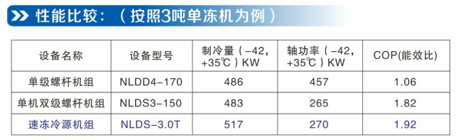 1、节能效果明显。速冻冷源机组高低压缩比1:3左右,这种配组节能效果明显优于传统的(高低压缩比1:2)单机双级螺杆压缩机。比单级压缩节能50%左右。
