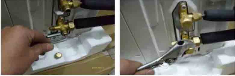 4、 从大阀门上将加氟口处螺帽拧下,加氟管拧到加氟口上,并确认顶针是否顶到位。(禁止使用钳子等工具拧紧接头。)