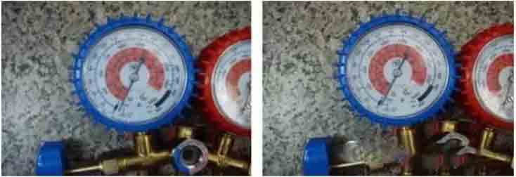 10、 确认无漏点后打开小阀门阀芯,当压力(低压)达到0.1 MPa-0.5 MPa时关掉小阀门。如此时压力表指针不动,则需少量打开压力表表阀,看是否有气体排出,如无气体排出则说明加氟管与空调阀门连接不到位,加氟管的顶针未顶开阀门的顶芯。此时应重新进行抽真空操作(从第四步开始)。