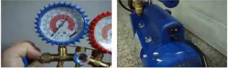 6、 抽真空:观察压力表(低压),压力到-0.1 MPa(负压)后停止抽真空,抽真空时间应根据机型和真空泵的大小来确定,参考时间10~30分钟,最低不得少于5分钟,并应根据压力表显示的压力值为准。