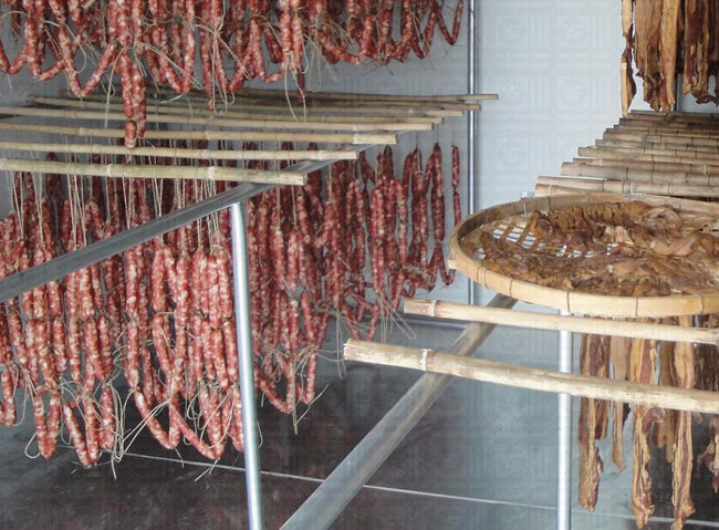 由于腊肉是由生肉制成的高脂肪食品,所以在烘干过程中必须保持低温,尽量减少脂肪被氧化,以保证腊肉的保质期较长。同时,经过充分腌制的腊肉吸收了大量的油、盐、水分,这就要求在烘干过程中要保证相当精准的温度和湿度,对烘干过程的要求高。
