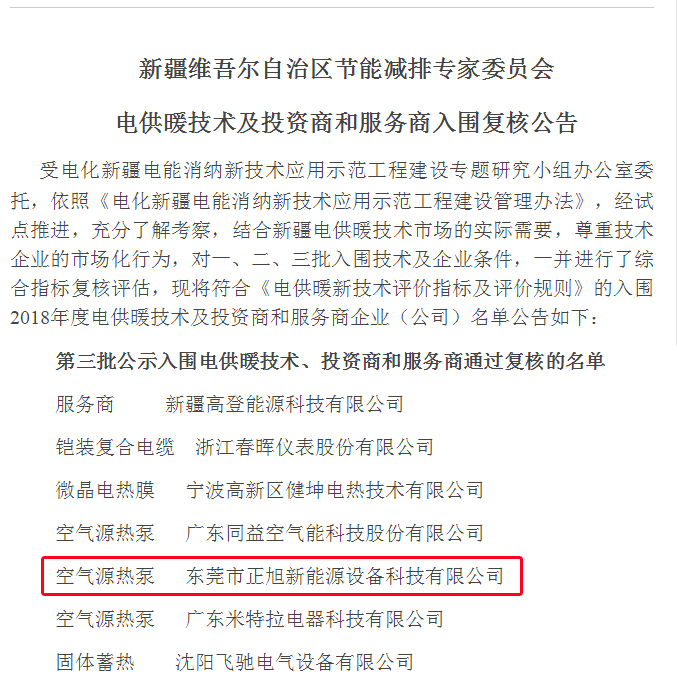 -东莞市正旭新能源设备科技有限公司为《空气源热泵》新疆电供暖技术及投资商和服务商第三批,并复核公告。