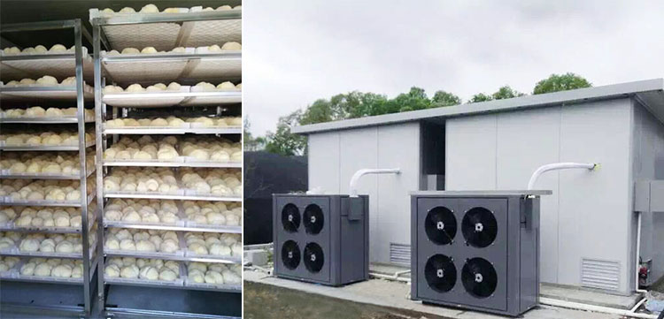 以正旭在哈尔滨某猴头菇基地烘干项目为例,该项目共有8个烤房,共安装了8台15P正旭分体式空气源热泵烘干机。设计每个烘烤房最高温度70℃,每次烘干3000公斤,除水量60%,烘干时间60个小时。项目自2016年完工以来,七年间一直稳定运行,得到客户的积极认同。