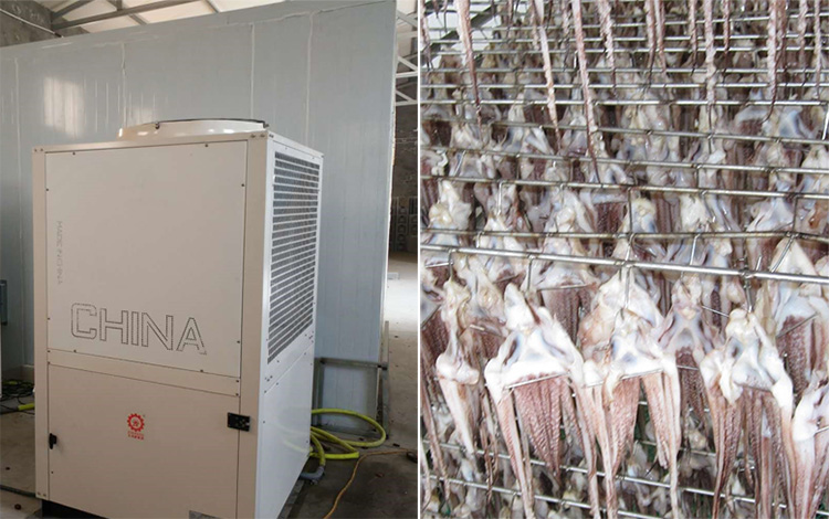 2.风速的掌握:在保持较大的循环风量和较高的风速下,鱿鱼与空气能充分接触,把鱿鱼蒸发出来的水蒸汽在循环风的作用下带离,再通过机组把水汽冷凝过滤掉排出到房体外。